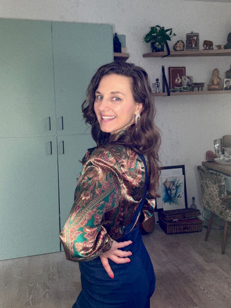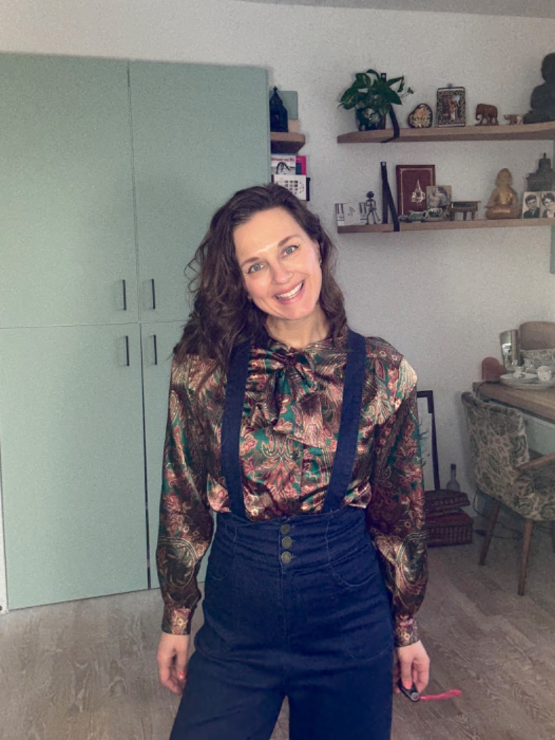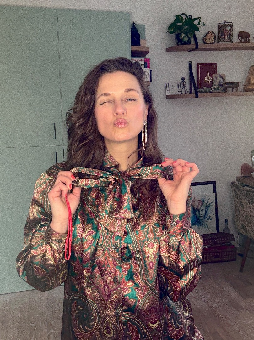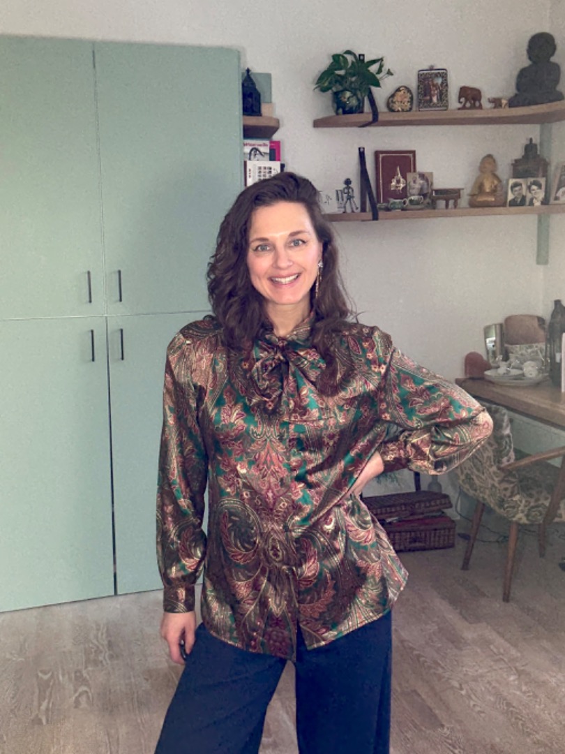 Feestelijk secretary blousje in warme kleuren met strik.