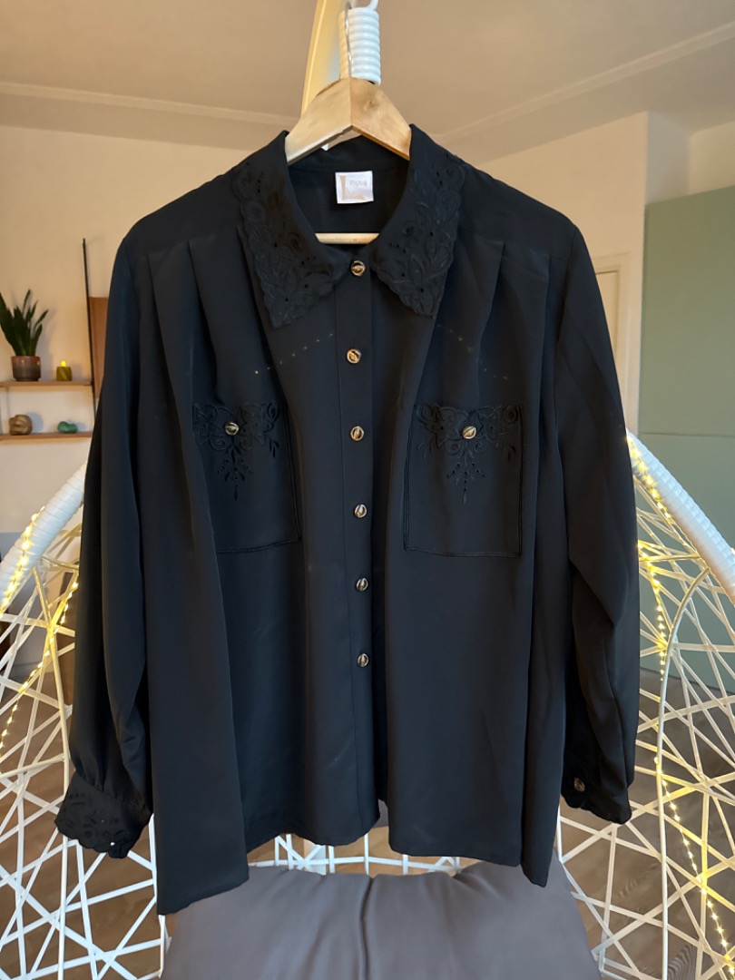 Klassieke zwarte bklouse met borduursel op kraag en mouwen.