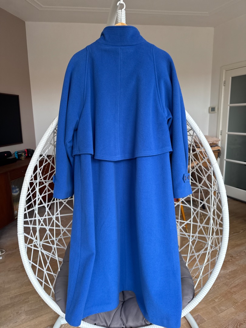 Plaatje van een wollen mantel in kobaltblauw. Opstaande kraag.