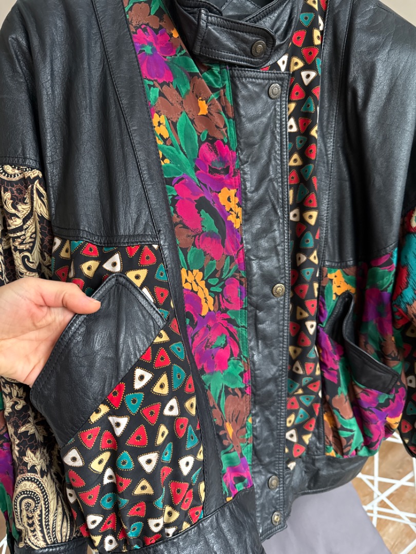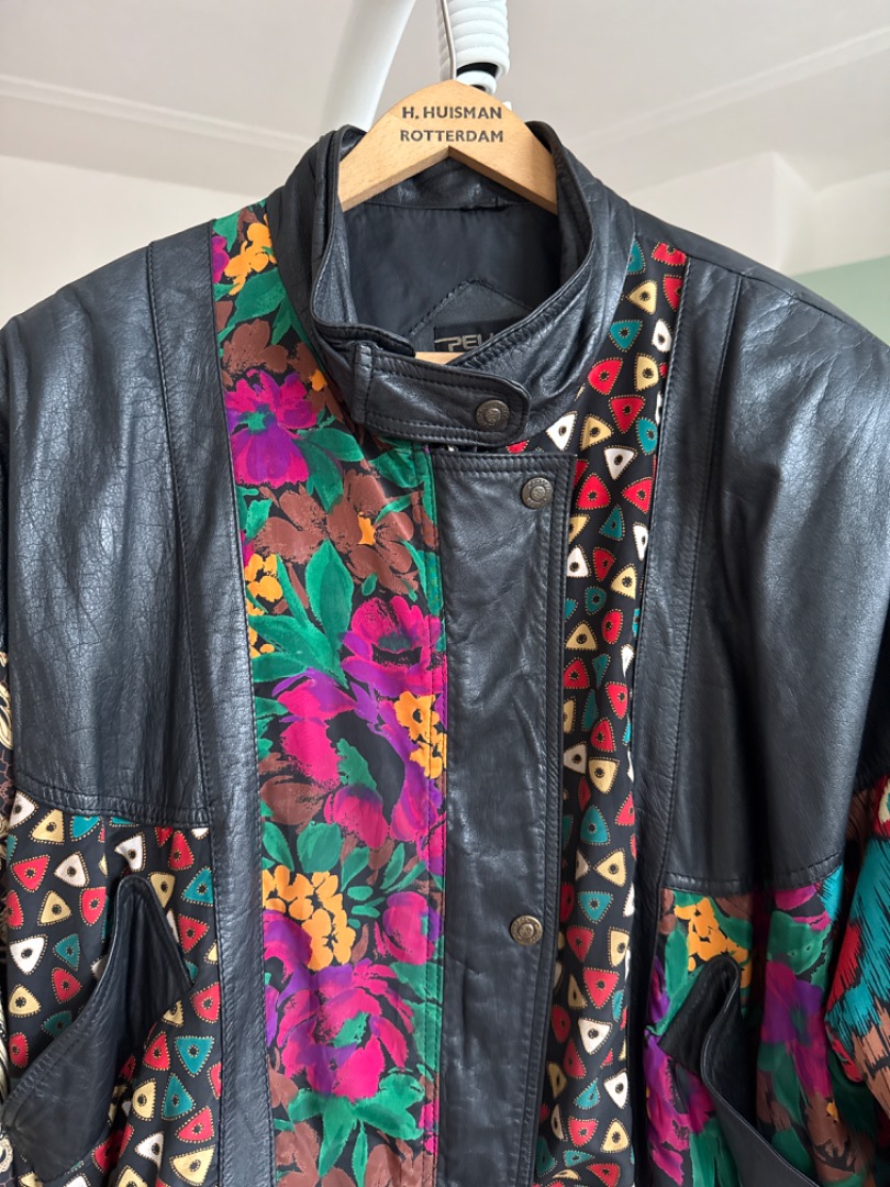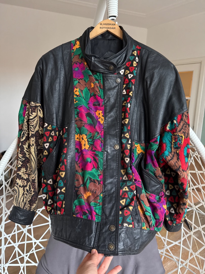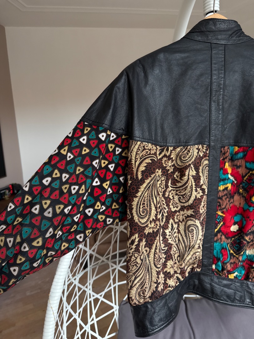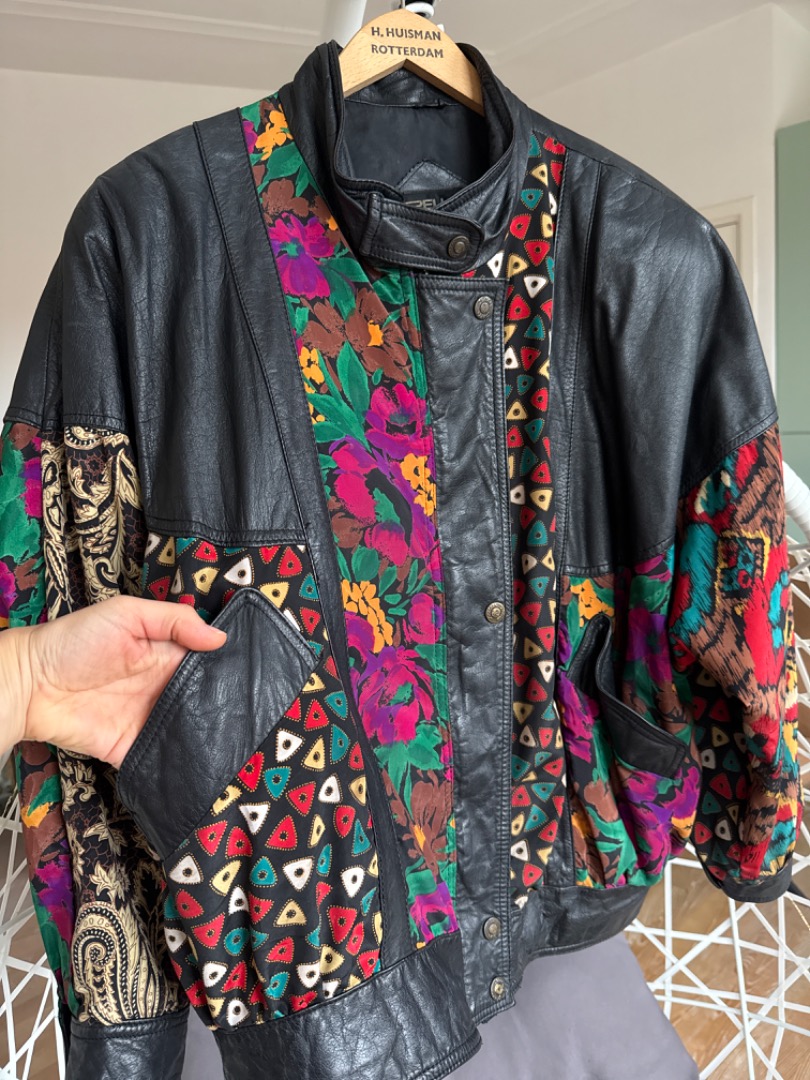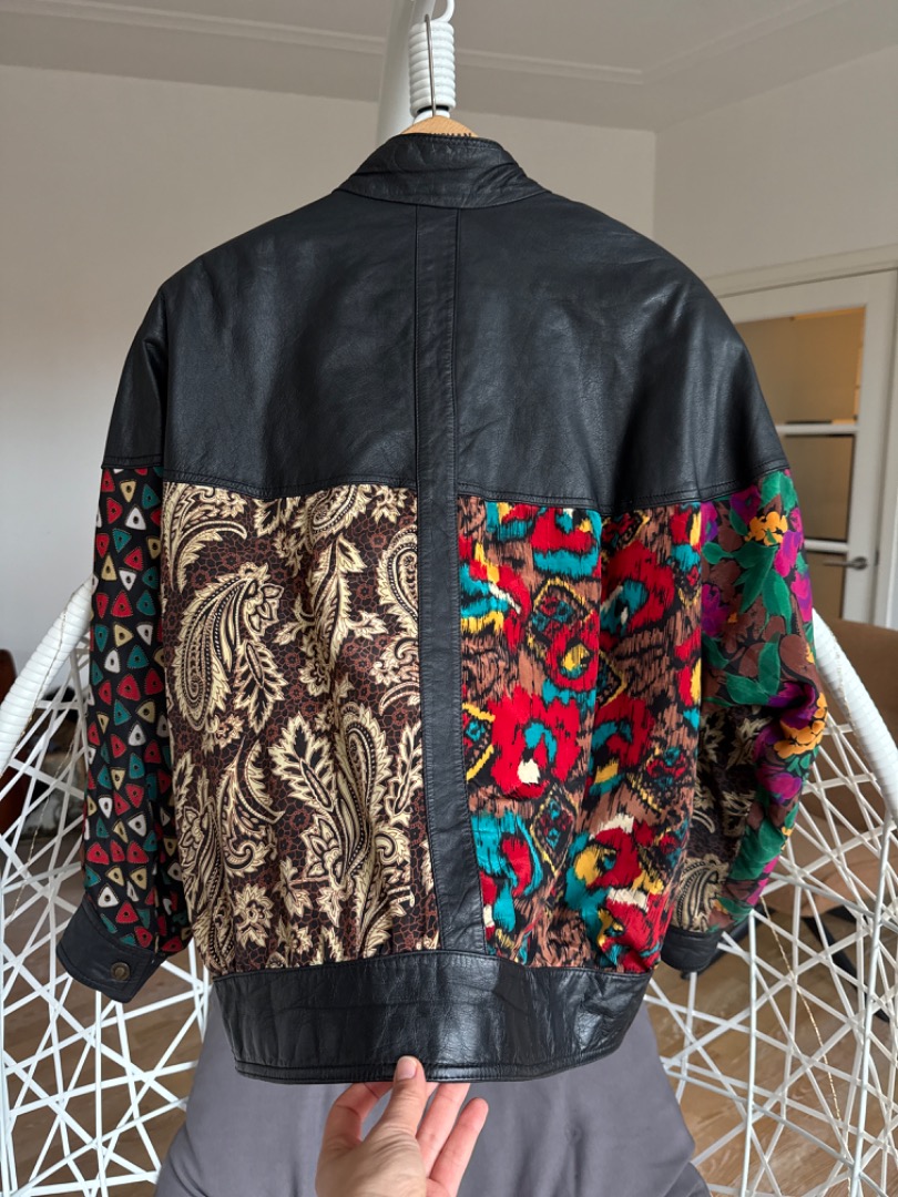 Te gekke vintage jas van leer en verschillende stukken stof met kekke print en kleuren.