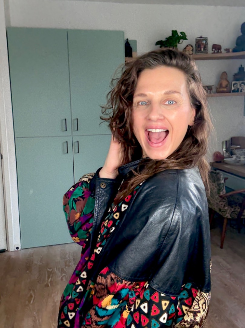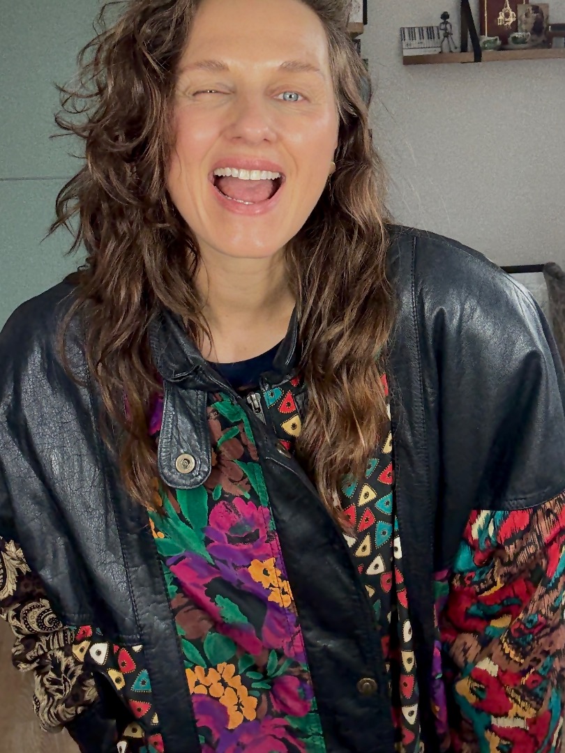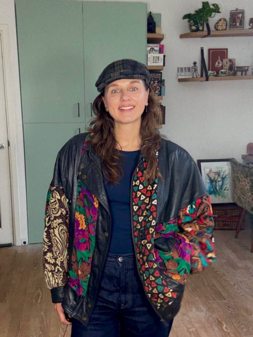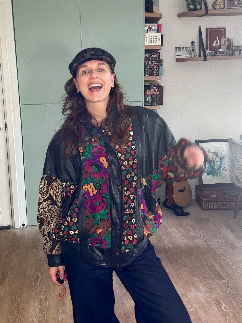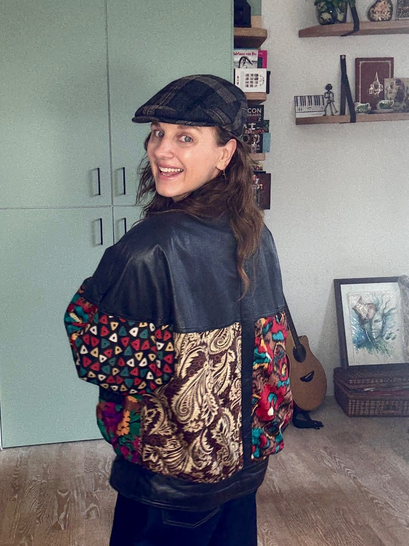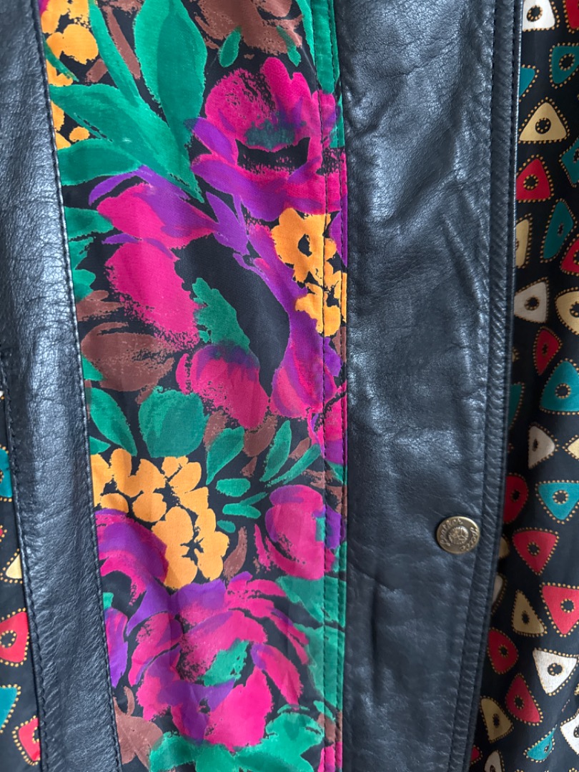 Te gekke vintage jas van leer en verschillende stukken stof met kekke print en kleuren.