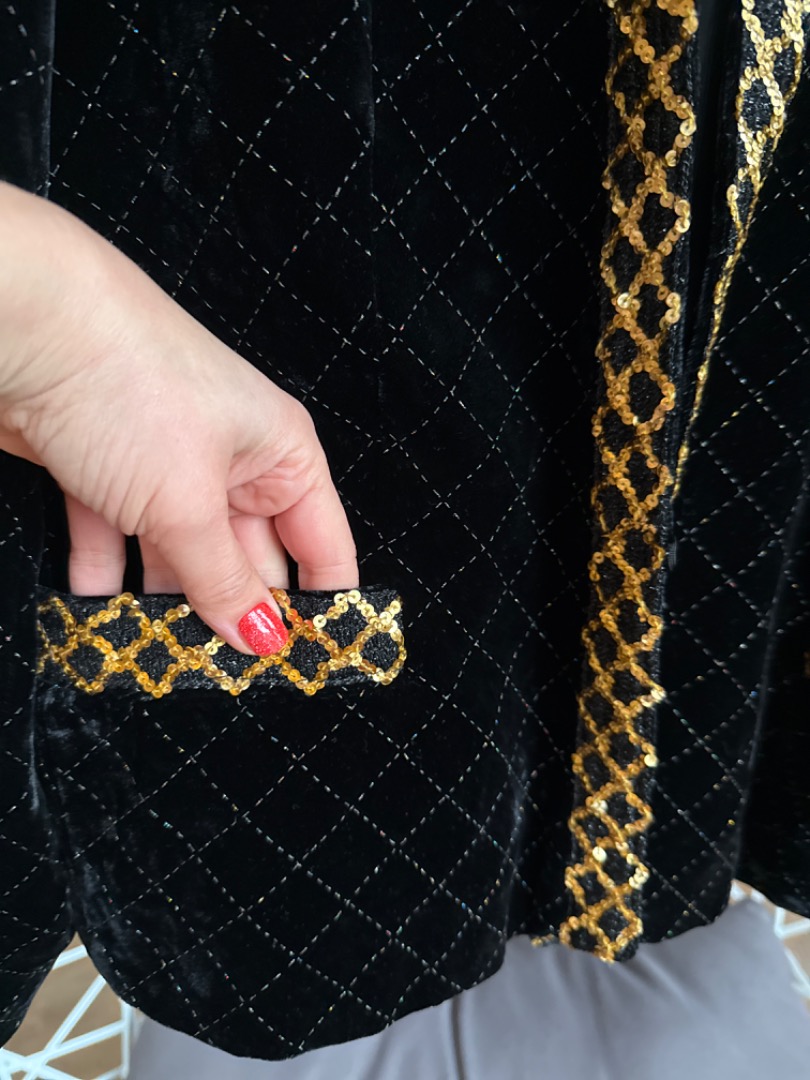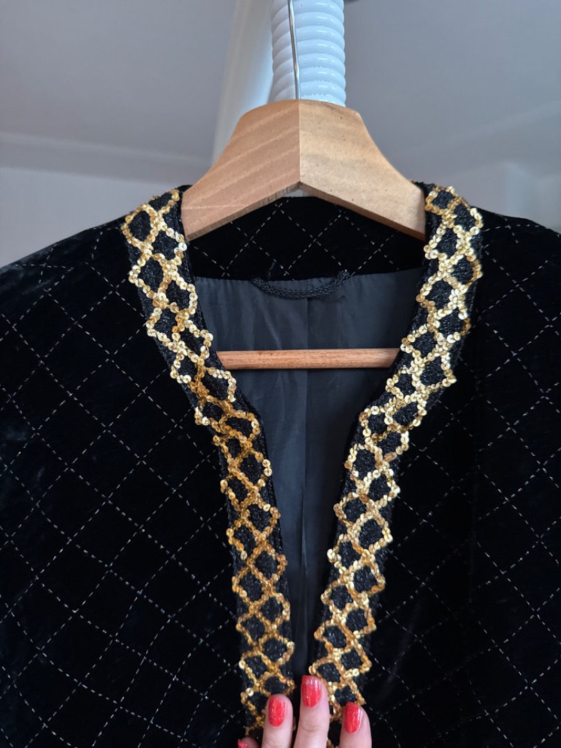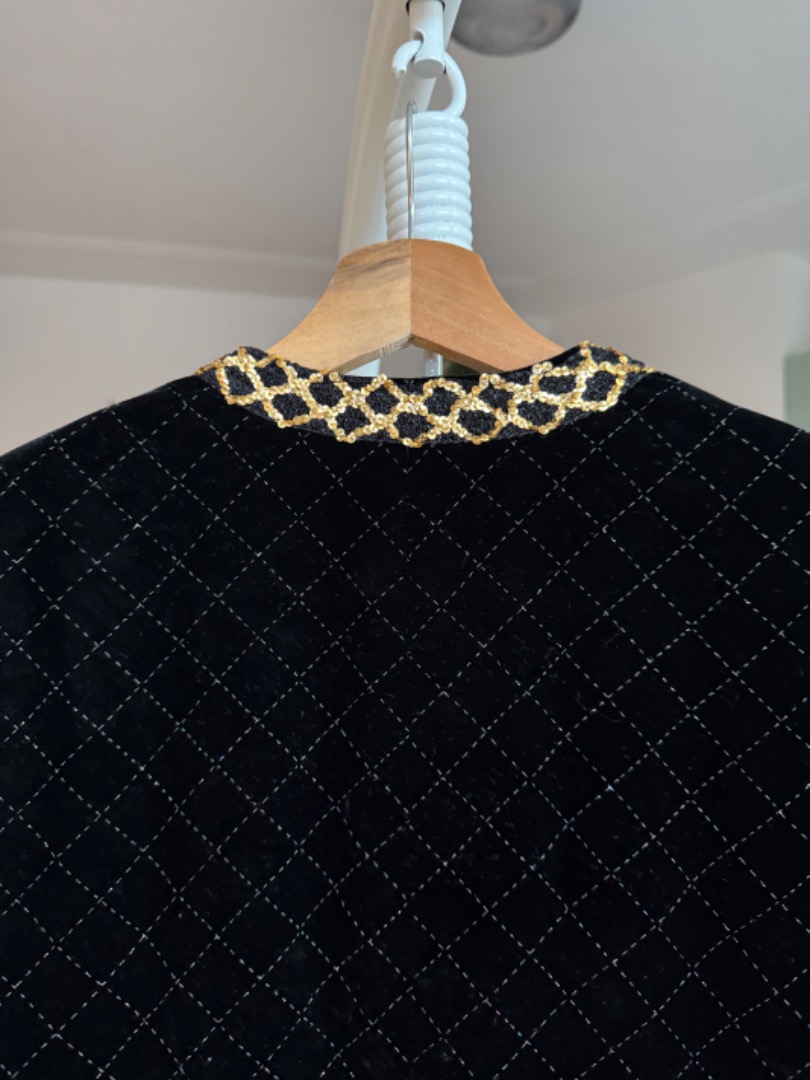 Schoudervulling, geen sluiting, afgezet met pailletten bij de randen. Doorgestikt patroon van ruitjes in t de stof met een draad met een holografisch effect; afhankelijk van de lichtval.
