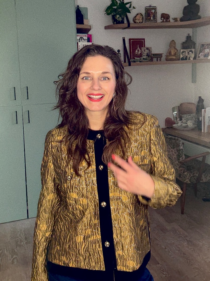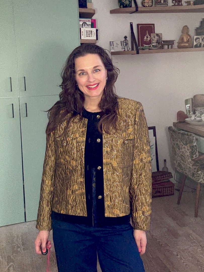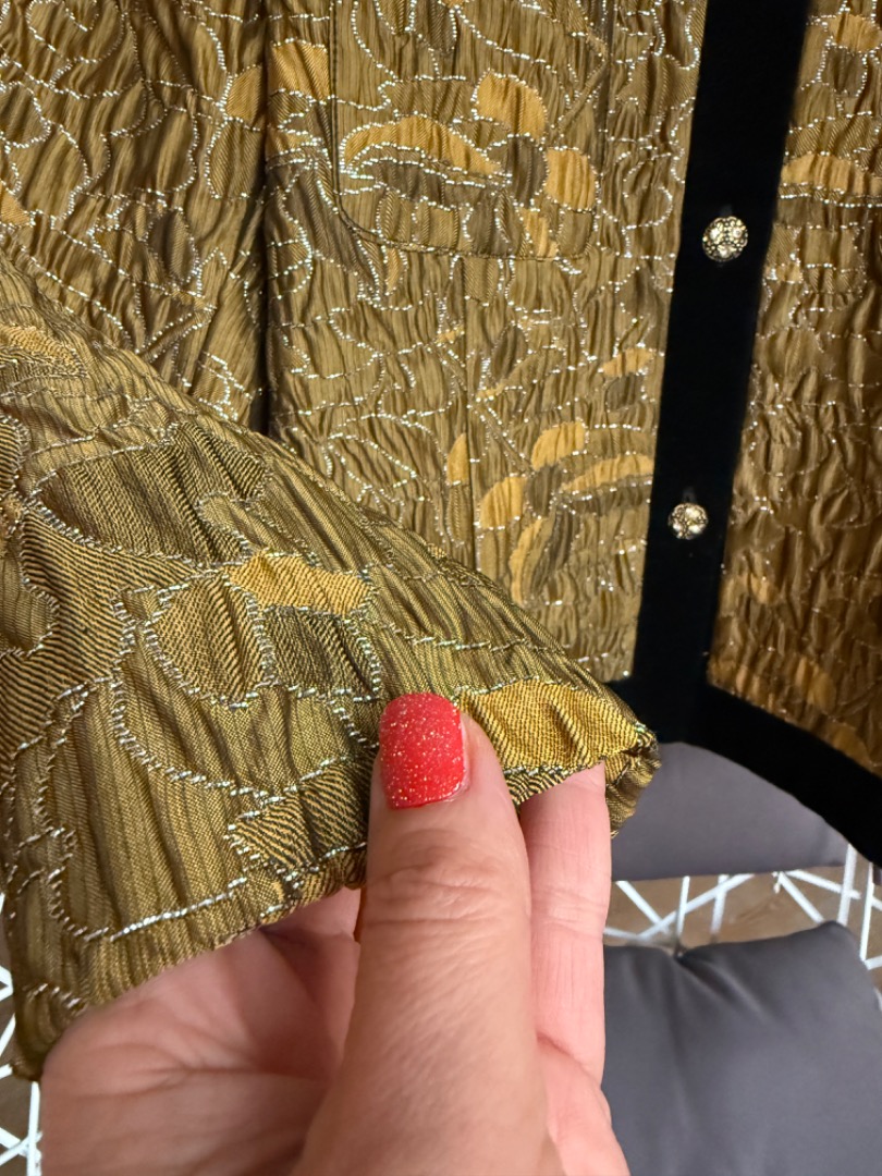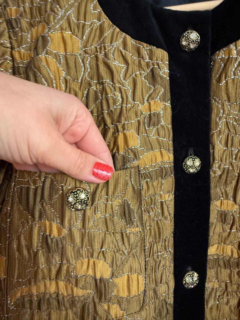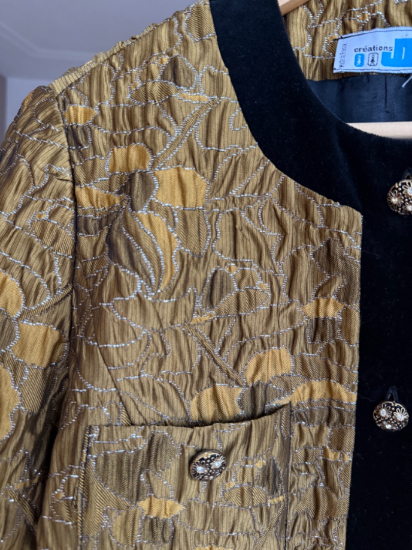 Heel mooi oker/brons kleurig jasje met zilveren draad; afgezet met fluwelen band en prachtige goudkleurige knoopjes met bloemetjes.