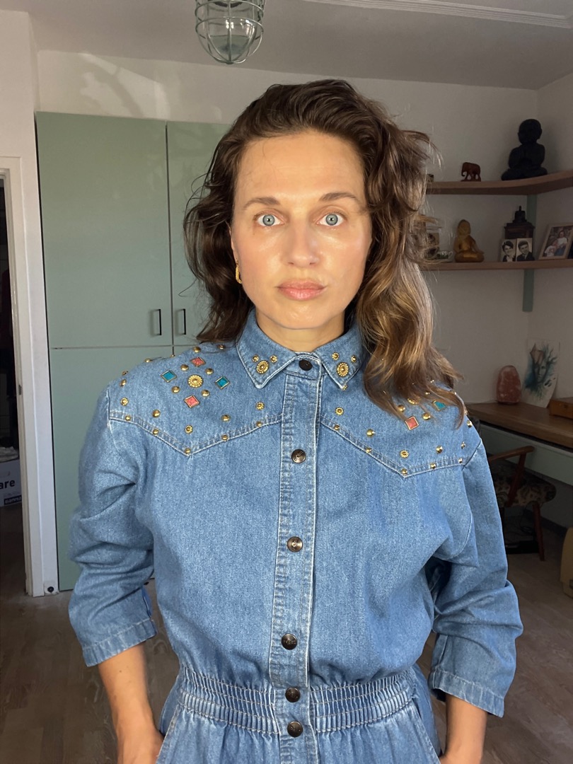 Deze jeans jumpsuit met 'gems' verkeert in super vintage staat.